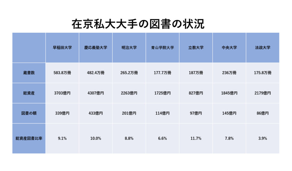 東京の大手私大の財務諸表と大学図書館の蔵書数を調べてみた。